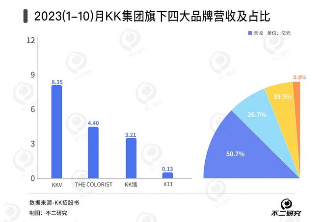 招股书数据显示,2023年前10个月KKV、THE COLORIST、KK馆、X11分别贡献了8.35亿元、4.40亿元、3.21亿元、0.13亿元营收,占总营收比重为50.7%、26.7%、19.5%和0.8%。