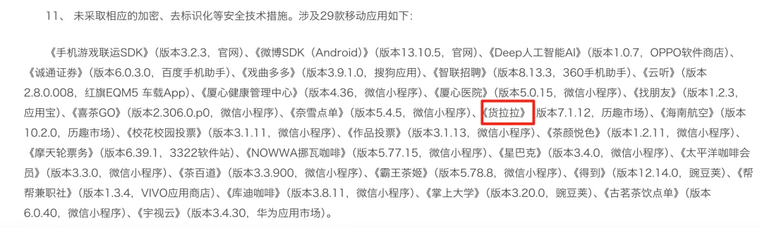事实上,这已是货拉拉年内第二次被推至监管风口浪尖。今年6月,其APP因未采取加密、去标识化等安全技术措施,以及存在违法违规收集使用个人信息的情况,被国家计算机病毒应急处理中心通报存在违规收集个人信息问题。