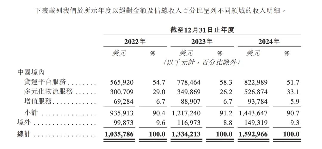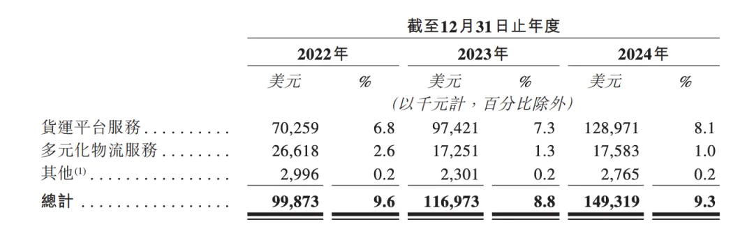 最新招股书披露,公司2022-2024年收入分别约为10.36亿、13.34亿和15.93亿美元(复合年增24.0%),其中2023年扭亏为盈净利9.73亿美元,2024年继续盈利4.34亿美元。平台收入主要来自货运平台服务,占比近60%。