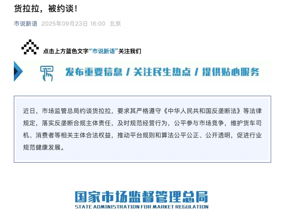 9月23日,市场监管总局约谈货拉拉,要求其严格遵守《中华人民共和国反垄断法》等法律规定,落实反垄断合规主体责任,及时规范经营行为,公平参与市场竞争,维护货车司机、消费者等相关主体合法权益,推动平台规则和算法公平公正、公开透明,促进行业规范健康发展。