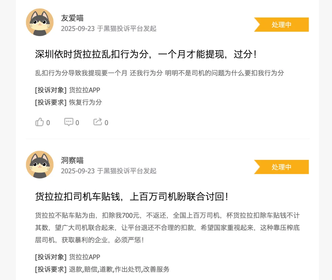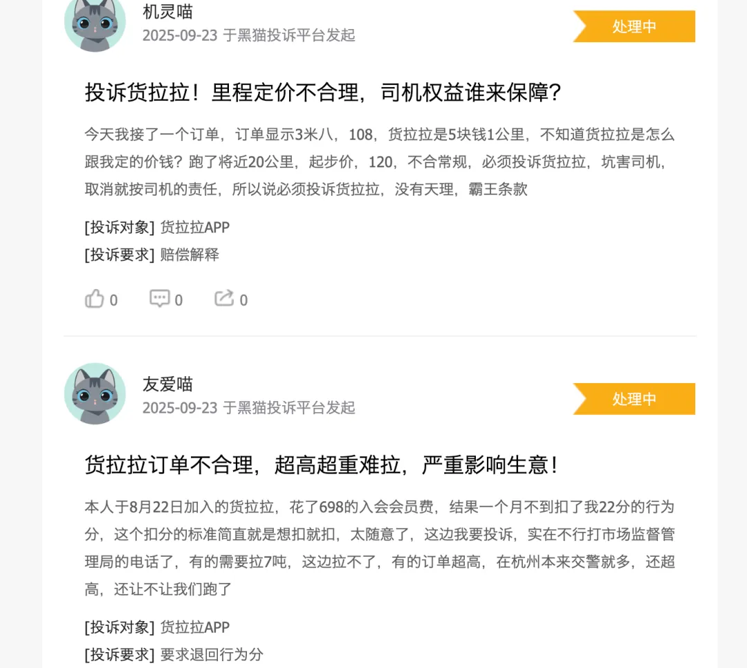 第一大痛点,司机权益诉求:众多司机投诉平台“压价”明显。根据黑猫投诉统计,与货拉拉相关的投诉累计超过8万起,约九成来自司机群体。