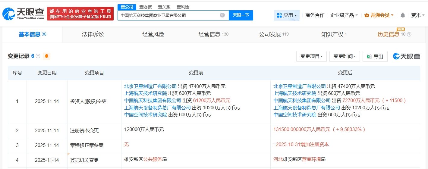 天眼查工商信息显示,近日,中国航天科技集团商业卫星有限公司发生工商变更,注册资本由12亿人民币增至13.15亿人民币,增幅约10%。