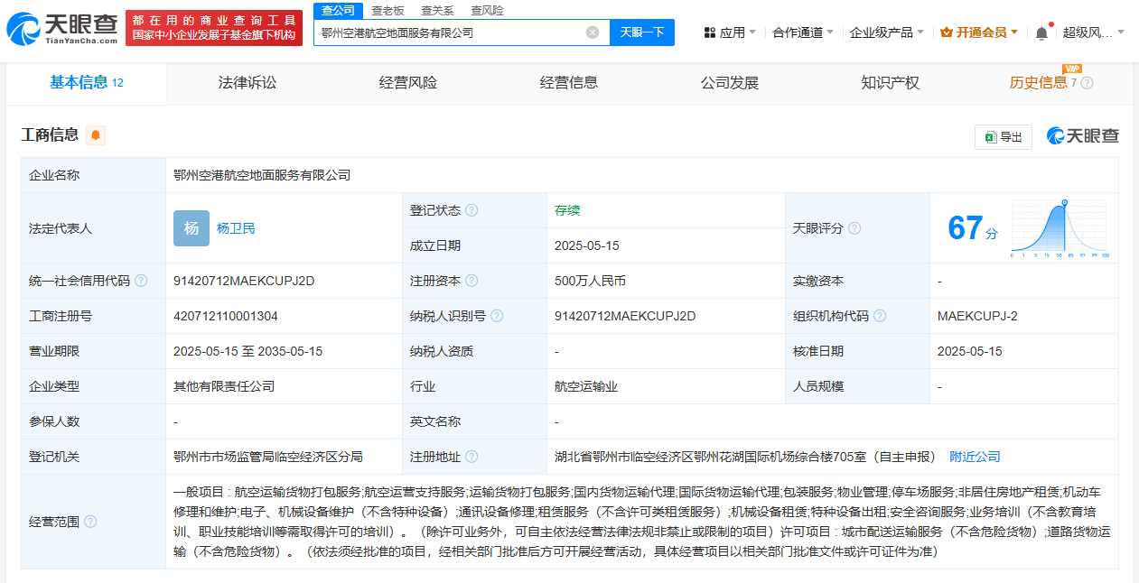 近日,鄂州空港航空地面服务有限公司成立,法定代表人为杨卫民,注册资本500万人民币,经营范围包括航空运输货物打包服务、航空运营支持服务、运输货物打包服务、国内货物运输代理等。