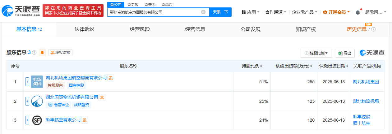 天眼查App显示,近日,鄂州空港航空地面服务有限公司成立,法定代表人为杨卫民,注册资本500万人民币,经营范围包括航空运输货物打包服务、航空运营支持服务、运输货物打包服务、国内货物运输代理等。股东信息显示,该公司由湖北机场集团航空物流有限公司、湖北国际物流机场有限公司、顺丰航空有限公司共同持股。