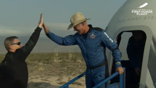“新谢泼德”载人太空舱借助降落伞平稳降落,蓝色起源公司团队驱车到场架设舱门,随着杰夫·贝索斯率先走出并与工作成员拥抱庆祝,他的首次太空之旅也无惊无险地落下帷幕。