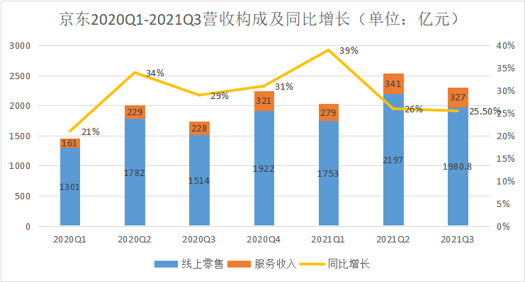 其次,第三方平台业务表现亮眼;在细分营收方面,京东集团财报显示,第三季度来自京东零售收入1980.8亿元,同比增长22.9%。在收入类别方面,来自商品的收入为1860亿元,占据总收入的85%,同比去年同期增加22.9%,略高于市场预期的1839亿元;服务收入占比327亿元(主要是第三方店家贡献),占总收入的15%,同比去年同期增加43.3%。