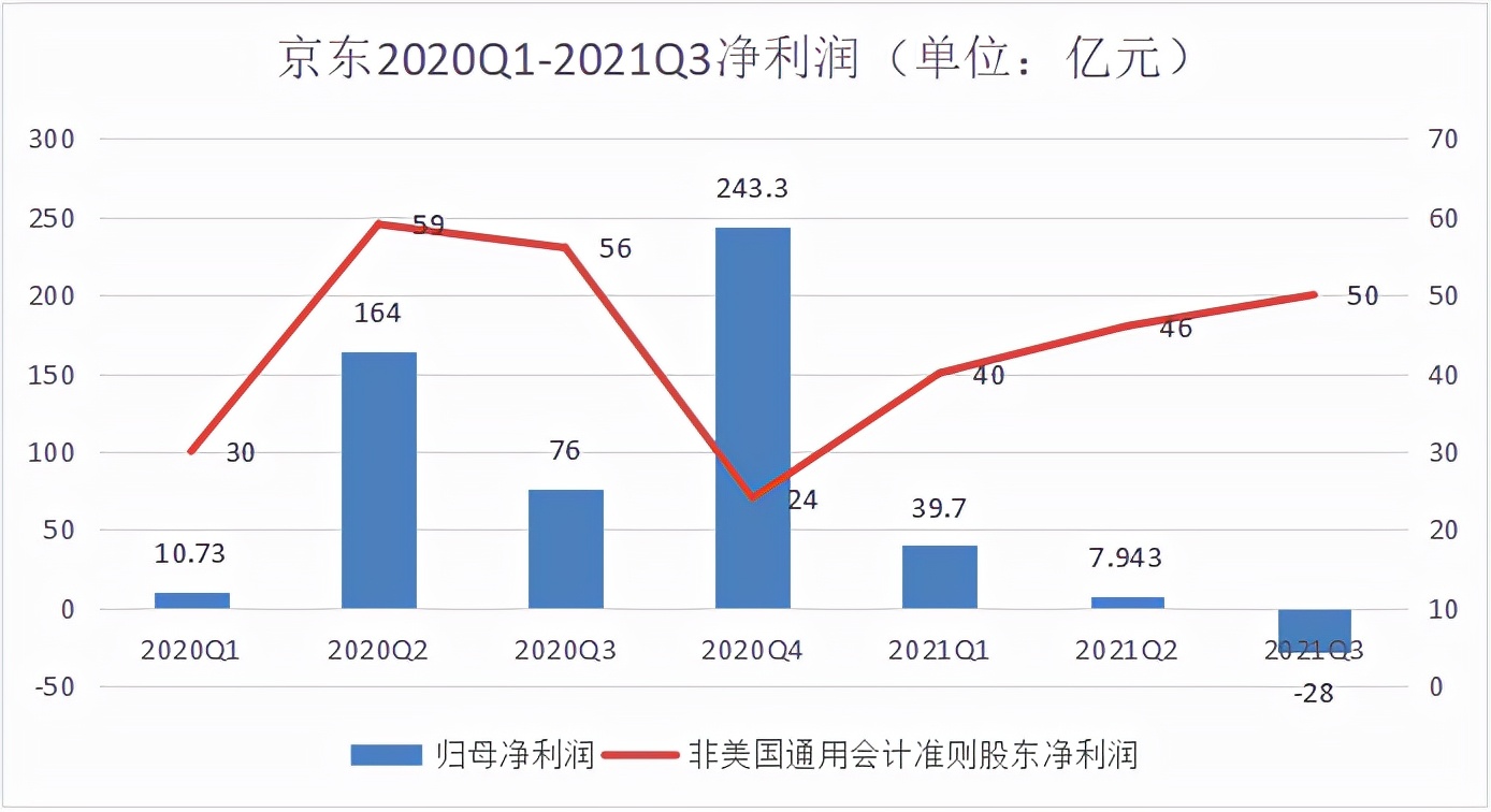 2021年第三季度京东归属于普通股股东的净亏损28亿元,去年同期为净利润76亿元。这个亏损数据和去年高盈利数据一样,参考性一般,其中大头是来源于上市公司股权投资股价变动导致。去年中概股、港股强势,这一块给京东带来很高的净利润,今年资本市场表现差,就带来了亏损,由于京东对外投资大多数是战略投资(比如说达达集团、永辉超市、唯品会等),非纯财务投资,因短期卖出变现可能性较小,该收益带来的增长和下跌短期影响可以忽略。