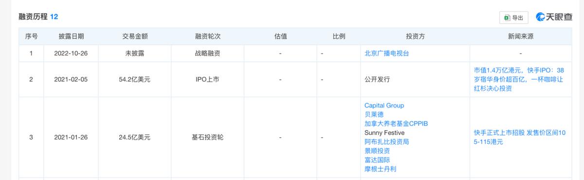 天眼查APP融资历程显示,快手科技于2021年2月份IPO,彼时市值1.4万亿港元。上市三年过去了,如今快手股价从当初的400多港元,跌到了44.3港元(11月22日收盘价)。