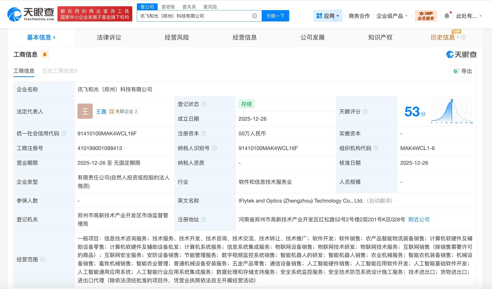 天眼查工商信息显示,近日,讯飞和光(郑州)科技有限公司成立,法定代表人为王鑫,注册资本50万人民币,经营范围含信息技术咨询服务、软件开发、农产品智能物流装备销售、信息系统集成服务、物联网设备销售、智能机器人的研发、人工智能应用软件开发、人工智能基础软件开发、人工智能通用应用系统等。股东信息显示,该公司由科大讯飞旗下上海讯飞和光科技有限公司全资持股。