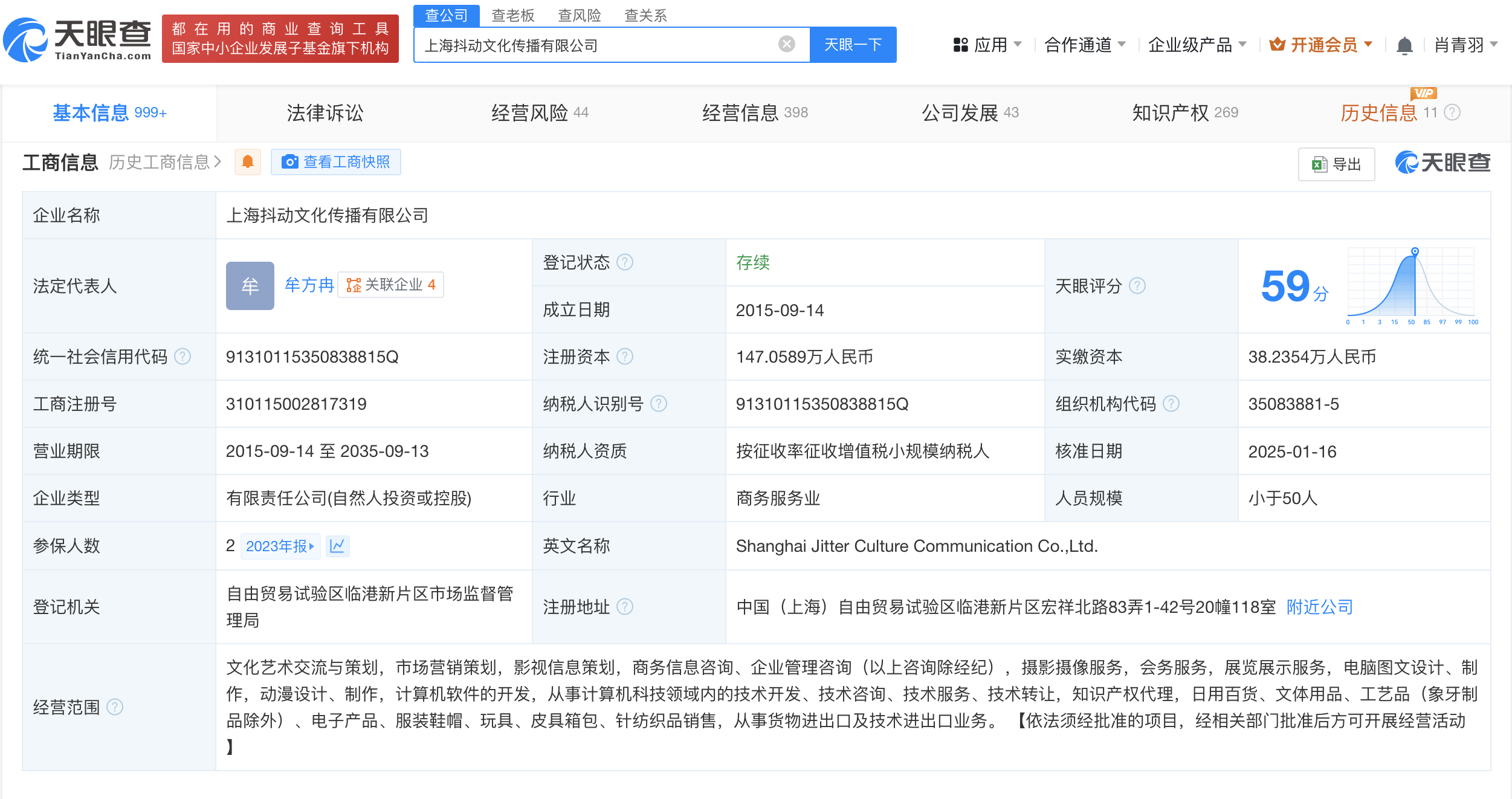 上海抖动文化传播有限公司成立于2015年9月,法定代表人为牟方冉,注册资本约147.1万人民币,经营范围包括文化艺术交流与策划、市场营销策划、影视信息策划、摄影摄像服务、会务服务、展览展示服务等,现由牟方冉、李云、上海源子创业投资中心(有限合伙)共同持股。