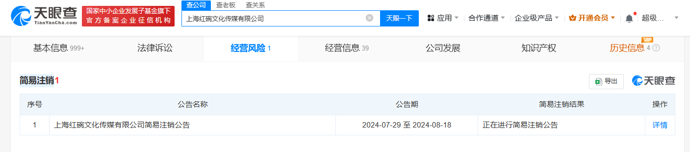 天眼查法律诉讼信息显示,近日,上海红碗文化传媒有限公司新增一则简易注销公告。