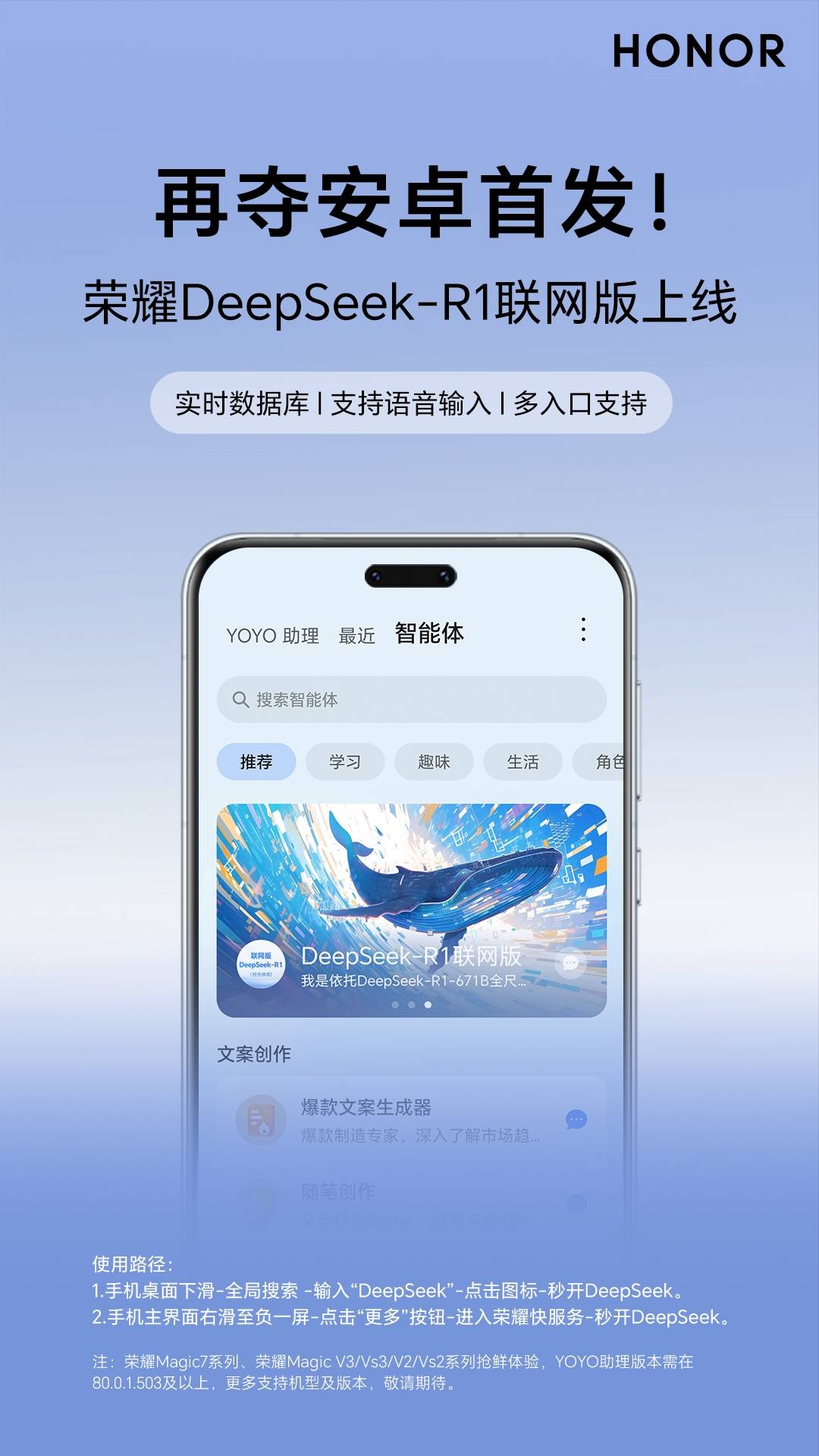 2月13日,荣耀DeepSeek-R1联网版正式上线,首批支持机型包括荣耀Magic7系列及部分折叠屏机型。