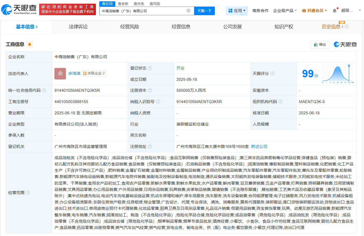 近日,中海油销售(广东)有限公司成立,法定代表人为佘浩滨,注册资本50亿人民币,经营范围包括成品油批发、成品油仓储、新能源汽车换电设施销售、新能源汽车整车销售、石油制品销售等。