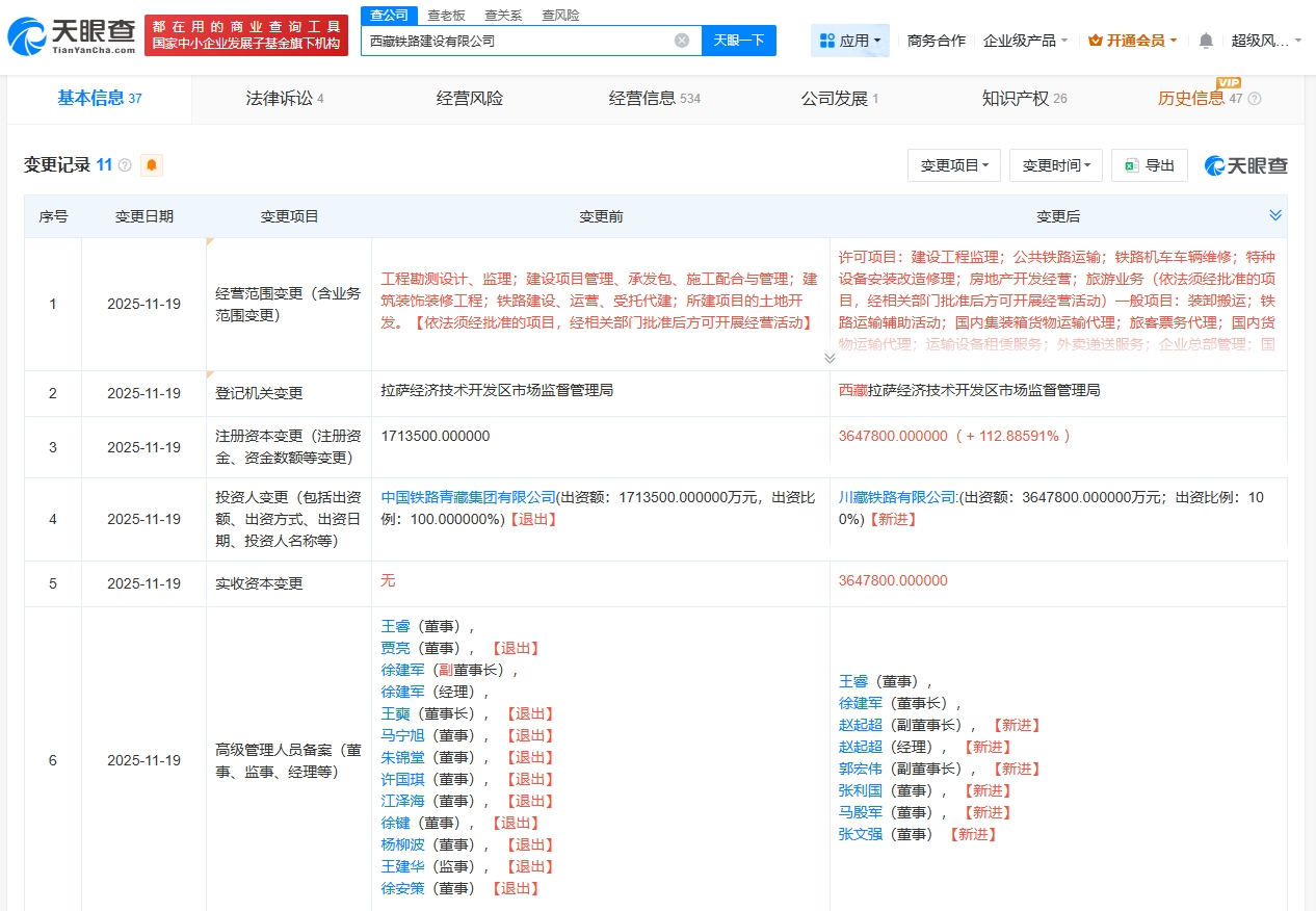 天眼查工商信息显示,近日,西藏铁路建设有限公司发生工商变更,原股东中国铁路青藏集团有限公司退出,新增川藏铁路有限公司为全资股东;注册资本由171.35亿人民币增至364.78亿人民币,增幅约113%;王奭卸任董事长,由徐建军接任,同时多位高管发生变更。