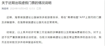 随后,公司又因“海昏侯假门票”事件登上热搜。国庆期间,多起游客投诉其在高德地图APP预约的海昏侯国遗址公园门票及讲解服务在公园内无法正常使用。海昏侯官方随即发布虚假门票情况说明,称公园未授权任何第三方机构或个人销售讲解票,并指出未经许可第三方实施的涉嫌侵权及欺骗消费者行为。