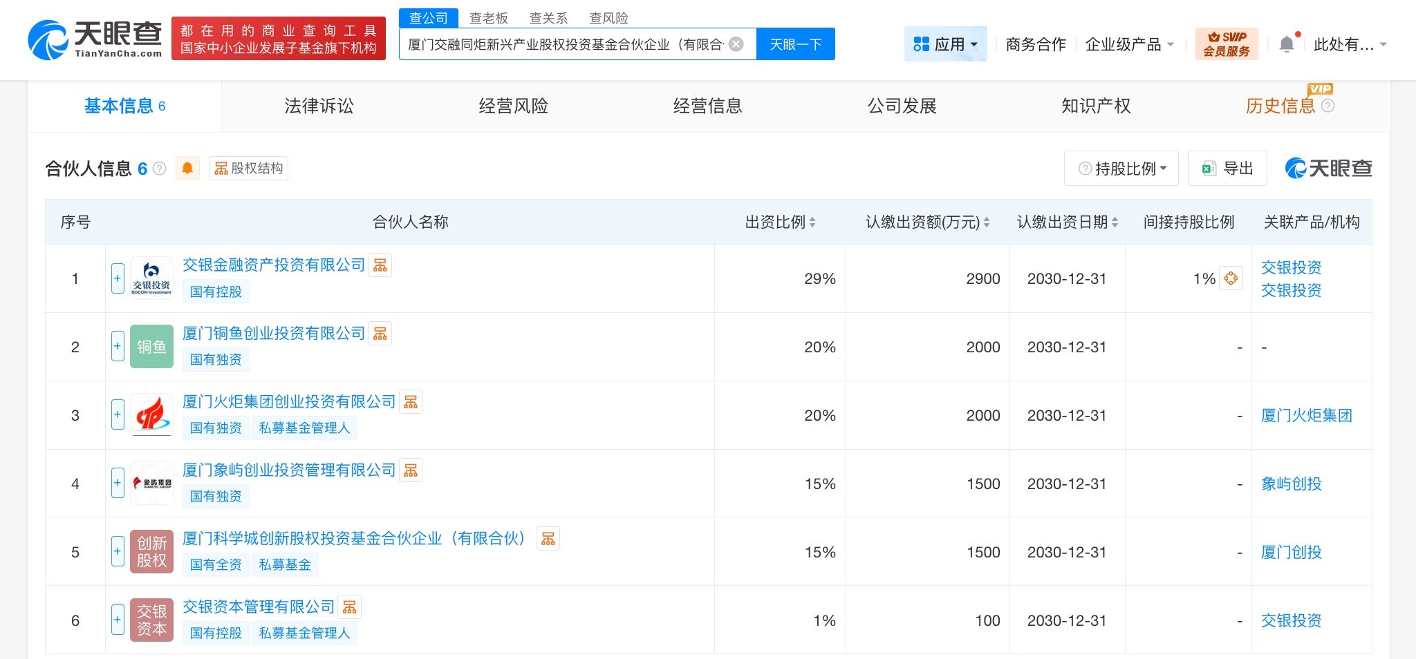 天眼查App显示,近日,厦门交融同炬新兴产业股权投资基金合伙企业(有限合伙)成立,执行事务合伙人为交银资本管理有限公司、厦门火炬集团创业投资有限公司,出资额1亿人民币,经营范围为以私募基金从事股权投资、投资管理、资产管理等活动。合伙人信息显示,该基金由交银金融资产投资有限公司、厦门铜鱼创业投资有限公司、厦门火炬集团创业投资有限公司、厦门象屿创业投资管理有限公司等共同出资。