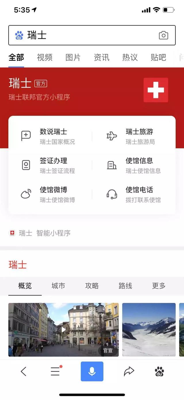 以瑞士国家小程序为例,是瑞士与百度合作的国家级小程序,瑞士将自己面向中国用户的国家窗口级别小程序,率先落地在了百度而非微信,正是说明了百度的搜索结果与品牌之间有着更强的关联,以及权威性,而小程序则可以将这种关联形成更强有力的转化。