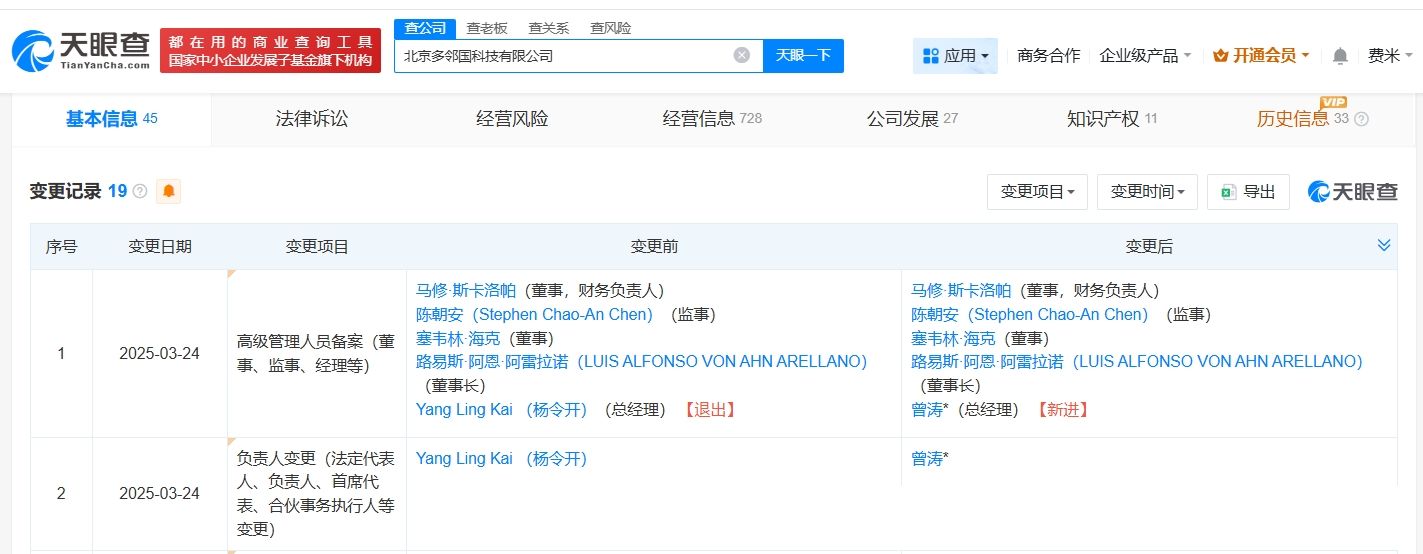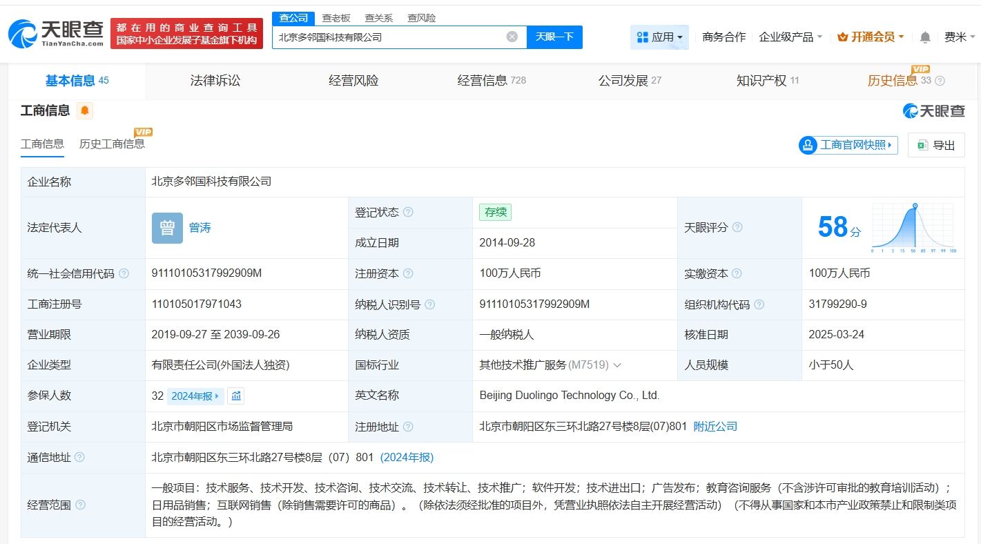 天眼查App显示,多邻国中国关联公司北京多邻国科技有限公司成立于2014年9月,注册资本100万人民币,经营范围包括软件开发、技术进出口、广告发布等。股东信息显示,该公司由Duolingo, Inc.全资持股。变更记录显示,去年3月,Yang Ling Kai (杨令开)卸任该公司法定代表人,由曾涛接任。