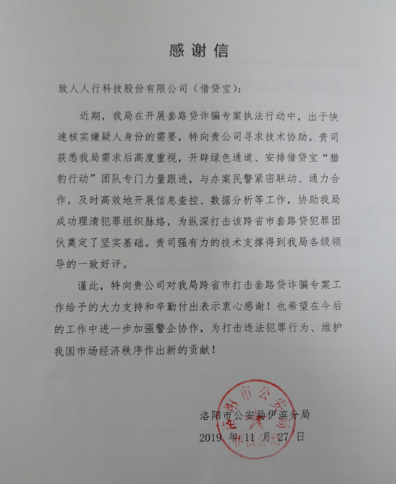 近日,借贷宝收到河南洛阳警方的一封感谢信。