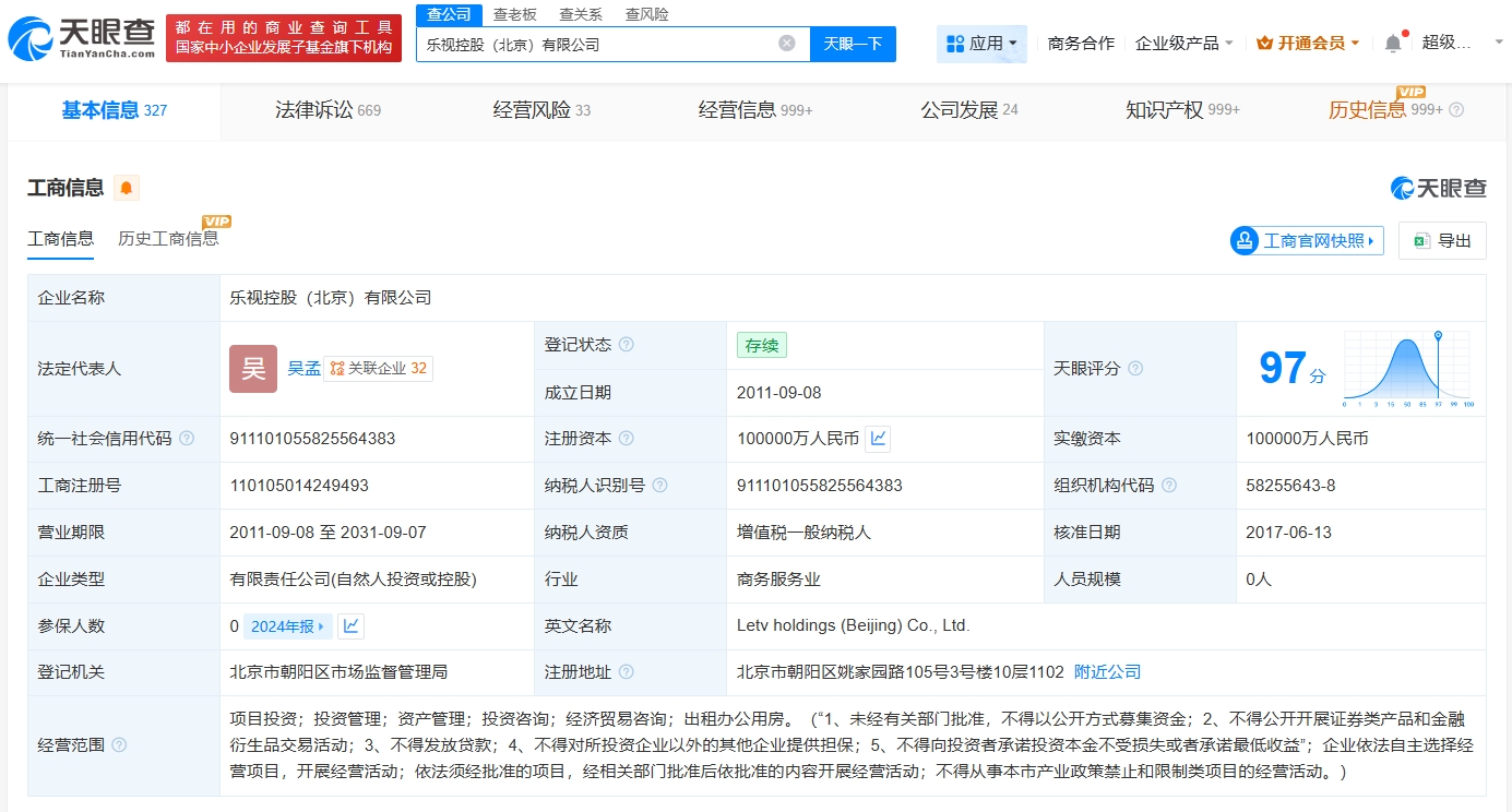 乐视控股(北京)有限公司成立于2011年9月,法定代表人为吴孟,注册资本10亿人民币,经营范围包括项目投资、投资管理、资产管理、投资咨询等。股东信息显示,该公司由贾跃亭、汇鑫资产管理(天津)合伙企业(有限合伙)等共同持股。
