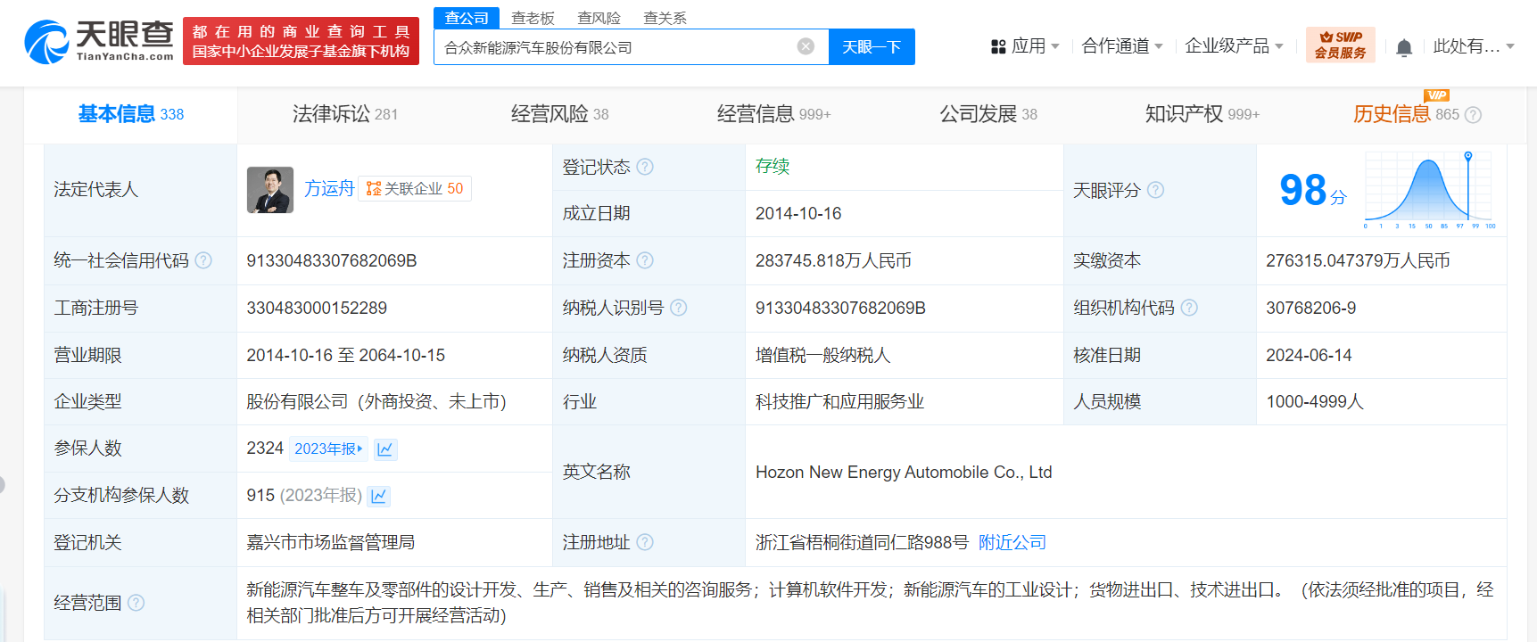 天眼查App显示,哪吒汽车关联公司合众新能源汽车股份有限公司成立于2014年10月,法定代表人为方运舟,注册资本约28.4亿人民币,经营范围为新能源汽车整车及零部件的设计开发、生产、销售及相关的咨询服务,计算机软件开发,新能源汽车的工业设计,货物进出口、技术进出口。股东信息显示,该公司由南宁民生新能源产业投资合伙企业(有限合伙)、北京华鼎新动力股权投资基金(有限合伙)、宜春市金合股权投资有限公司等共同持股。