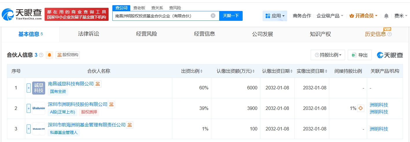 天眼查工商信息显示,1月15日,南昌洲明股权投资基金合伙企业(有限合伙)成立,执行事务合伙人为深圳市前海洲明基金管理有限责任公司,出资额1亿人民币,经营范围为以私募基金从事股权投资、投资管理、资产管理等活动。