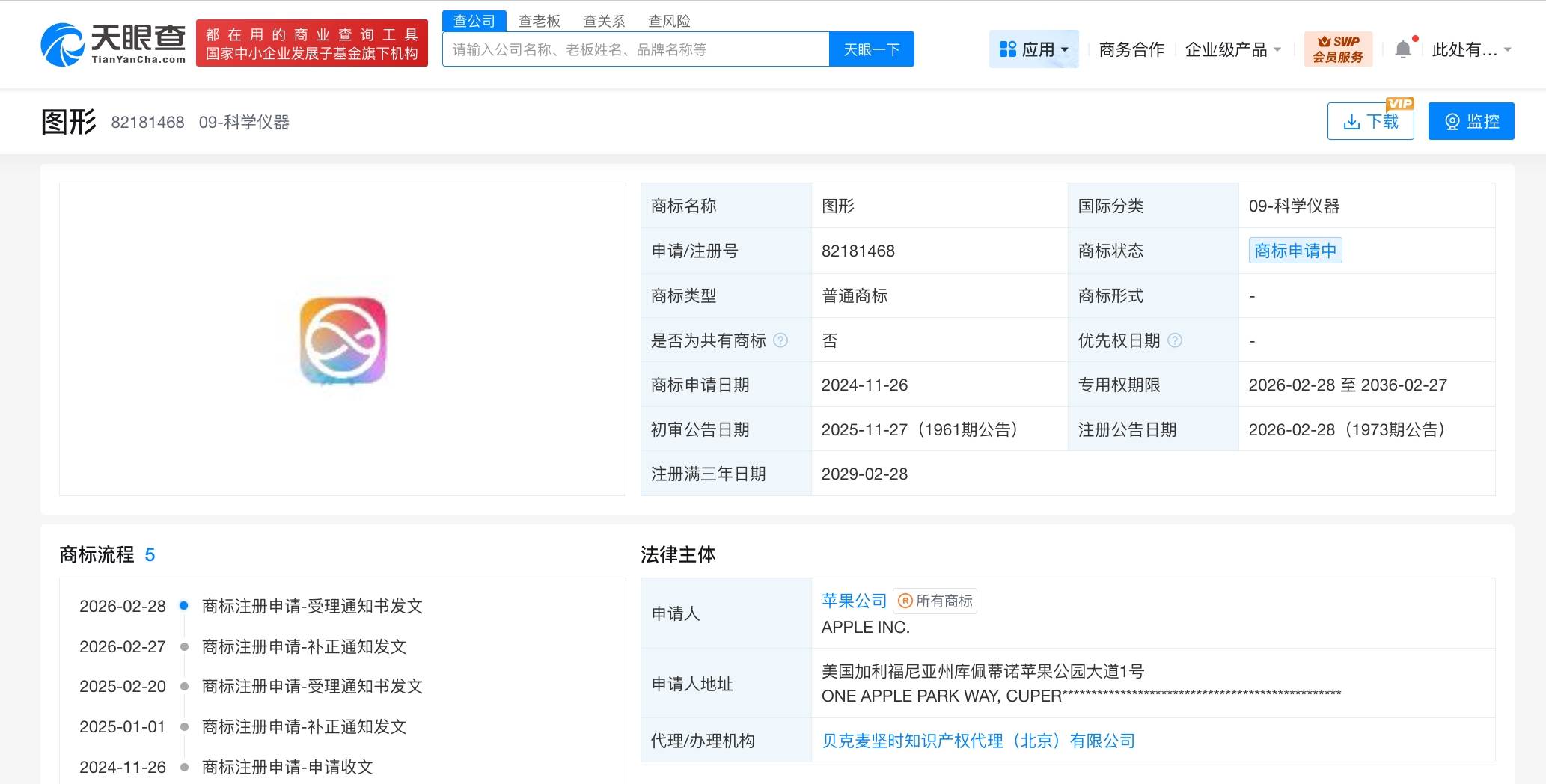天眼查知识产权信息显示,2024年,苹果公司已在中国申请注册多枚苹果智能相关图形商标,国际分类涉及网站服务、教育娱乐、科学仪器等,当前多枚商标已被驳回复审,部分商标状态为初审公告。