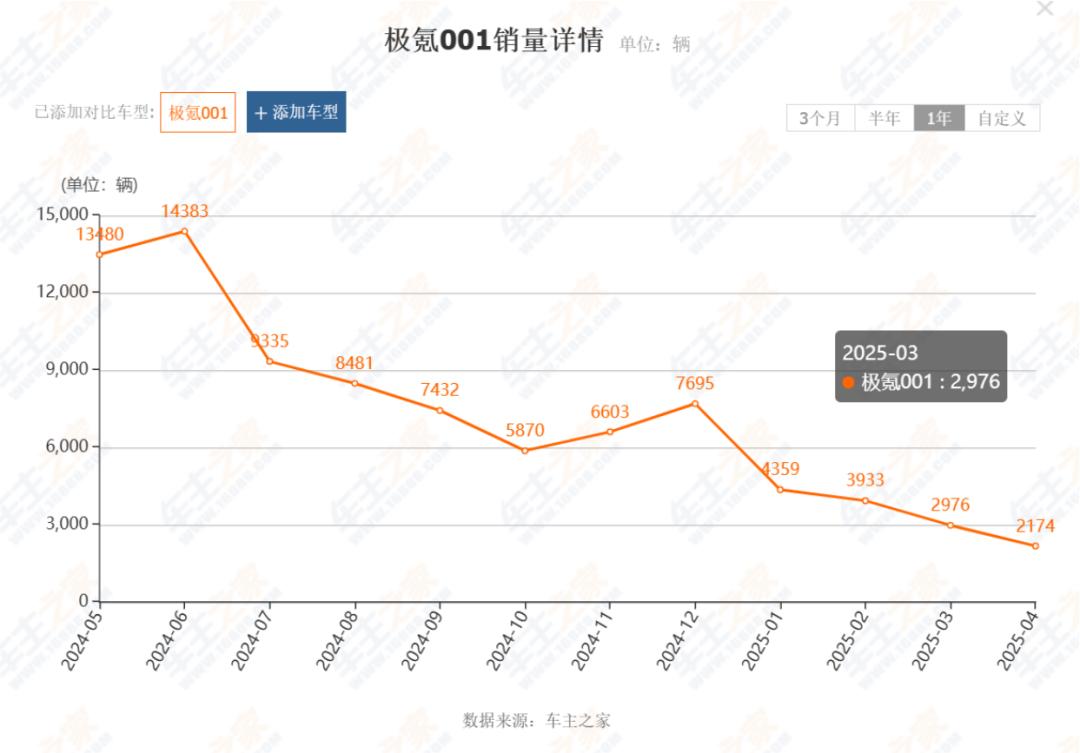 而且,今年极氪001的销量出现了显著下滑。根据车主之家数据,今年1-4月,极氪001的销量分别为4359辆、3933辆、2976辆、2174辆,单月销量较巅峰期暴跌近80%。