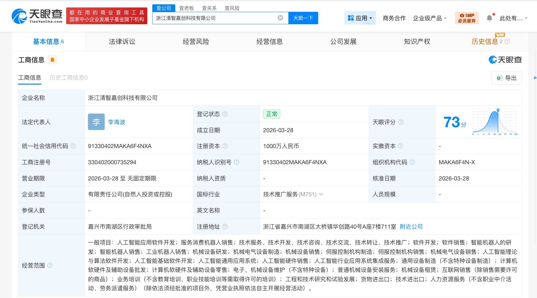 天眼查工商信息显示,近日,浙江清智嘉创科技有限公司成立,法定代表人为李海波,注册资本1000万人民币,经营范围包括人工智能应用软件开发、智能机器人的研发、智能机器人销售、工业机器人销售、伺服控制机构制造等。