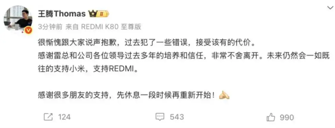 小米中国区市场部总经理王腾因“泄露公司机密信息”及“存在利益冲突”等严重违规违纪行为被辞退。根据小米集团职业道德委员会发布的内部通报,王腾被查实存在向外部人员传递公司未公开机密信息的行为,且涉及利益冲突等严重违规。