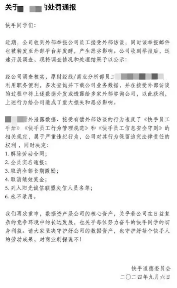 此后,快手发布处罚通报称,经调查核实,原财经线/商业分析部某员工利用职务便利,多次查询并下载公司业务数据,并在接受外部访谈的过程中将上述数据外发或透露给多家外部咨询公司,以此获利。快手决定对其,解除劳动合同;全员实名通报;取消全部长期激励;取消绩效奖金;列入阳光诚信联盟失信人员名单;永不录用。