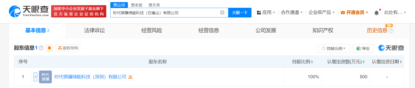 天眼查App显示,近日,时代骐骥绿能科技(石嘴山)有限公司成立,法定代表人为宁帅,注册资本500万人民币,经营范围含建设工程施工、检验检测服务、供电业务、新能源汽车换电设施销售、新能源汽车整车销售、新兴能源技术研发、电动汽车充电基础设施运营、合同能源管理等。股权全景穿透图显示,该公司由时代骐骥绿能科技(深圳)有限公司全资持股,后者为宁德时代(300750)旗下时代骐骥新能源科技(深圳)有限公司全资子公司。
