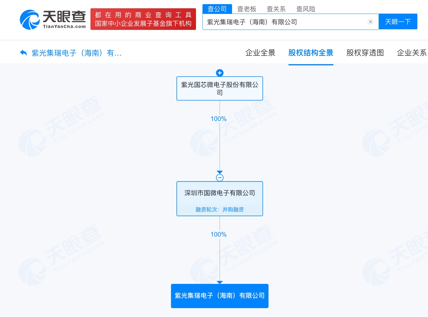 天眼查工商信息显示,近日,紫光集瑞电子(海南)有限公司成立,法定代表人为李天池,注册资本5000万人民币,经营范围包括集成电路设计、集成电路制造、集成电路销售、集成电路芯片设计及服务、电子专用材料制造、软件开发等。股权全景穿透图显示,该公司由深圳市国微电子有限公司全资持股,后者为紫光国微(002049)全资子公司。
