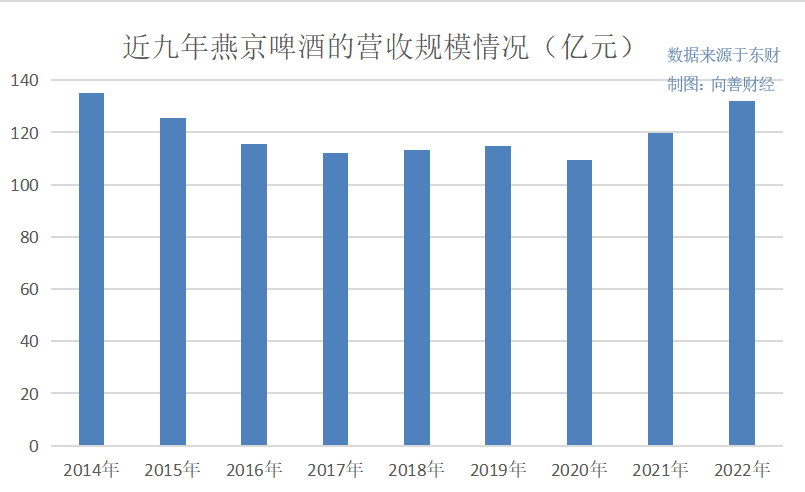 资本市场有号称赖以立身的“三碗面”:基本面、资金面和情绪面。其中,资金面和情绪面附着于基本面,虽远必至。从基本面的财报数据来看,2014——2020——2022年,燕京啤酒分别实现营收135亿元、125.4亿元、115.7亿元、112亿元、113.4亿元、114.7亿元——109.3亿元——119.6亿元、132亿元。