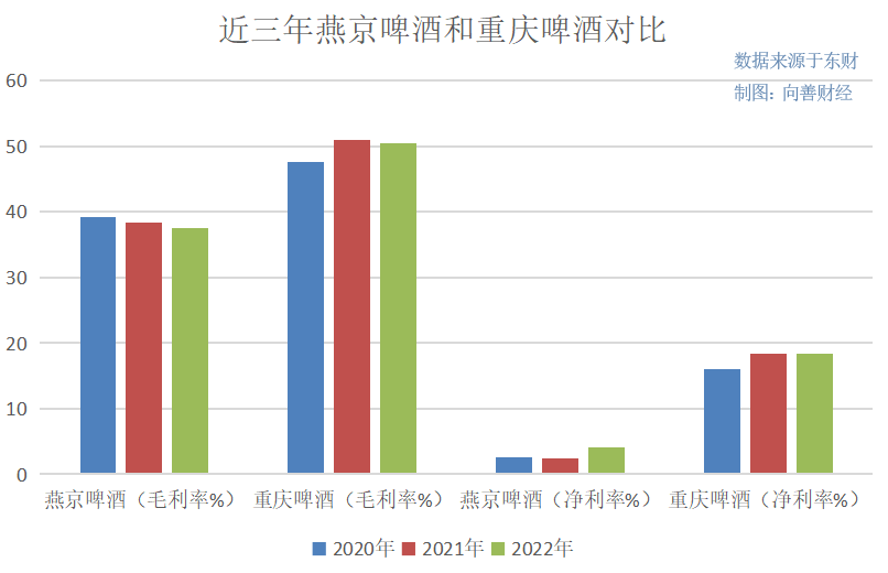 这里我们以同是在发力高端化,且营收规模相差无几的重庆啤酒为例,2020年——2022年重庆啤酒的毛利率和净利率分别为47.68%、50.94%、50.48%;16.02%、18.29%、18.43%,净利率几乎是燕京啤酒的4——8倍。