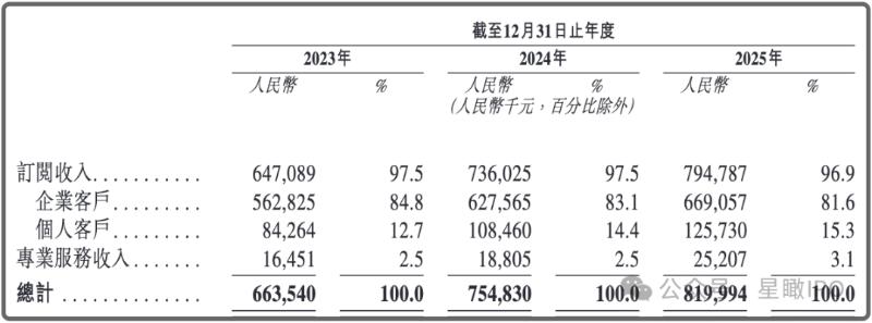 从收入结构来看,群核科技主要采用订阅模式运营,报告期内公司的收入主要来自企业及个人客户的软件订阅,其次是提供专业服务。2023年-2025年间,订阅收入占到了公司总收入的约97%,2025年已经达到了7.95亿元,其中企业客户成为收入支柱,贡献了占比超过80%的收入;专业服务收入占比仅约3%。