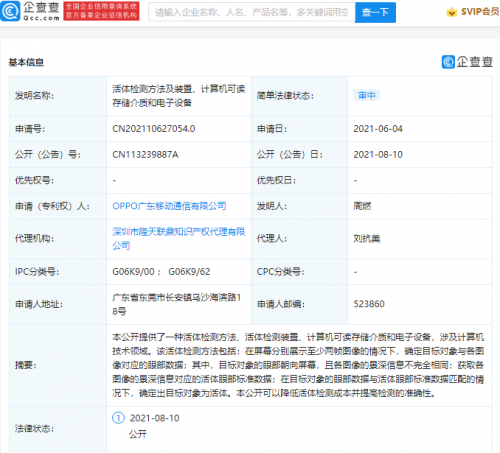 【TechWeb】企查查APP显示,8月10日,OPPO广东移动通信有限公司公开“活体检测方法及装置、计算机可读存储介质和电子设备”专利,公开号为CN113239887A。