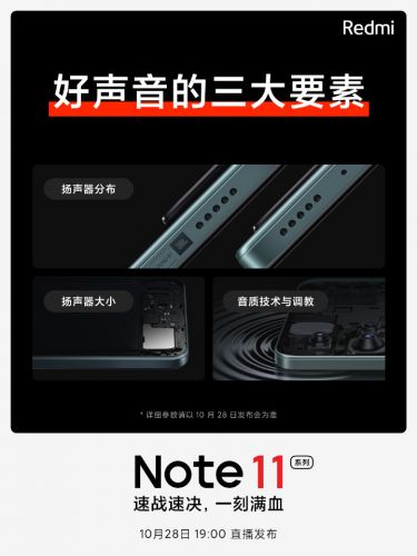 最近被网友热议已久的Redmi Note 11系列将于明日晚7点发布正式发布,今日Redmi官方透露了该系列机型在扬声器方面的配置细节。Note 11系列将搭载JBL对称式立体扬声器,上方下方的发声单元体积相当,边框开孔数量也相同,保证了声音的对称。
