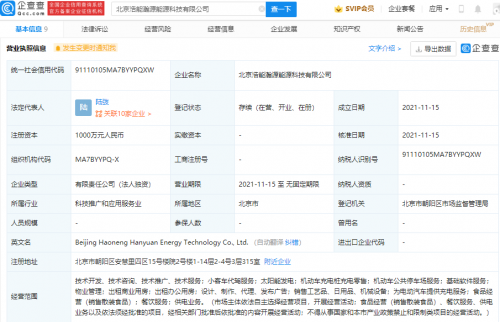 【TechWeb】企查查APP显示,11月15日,北京浩能瀚源能源科技有限公司成立,法定代表人为陆弢,注册资本1000万元人民币,经营范围包含:小客车代驾服务;太阳能发电;机动车充电桩充电零售;机动车公共停车场服务等。