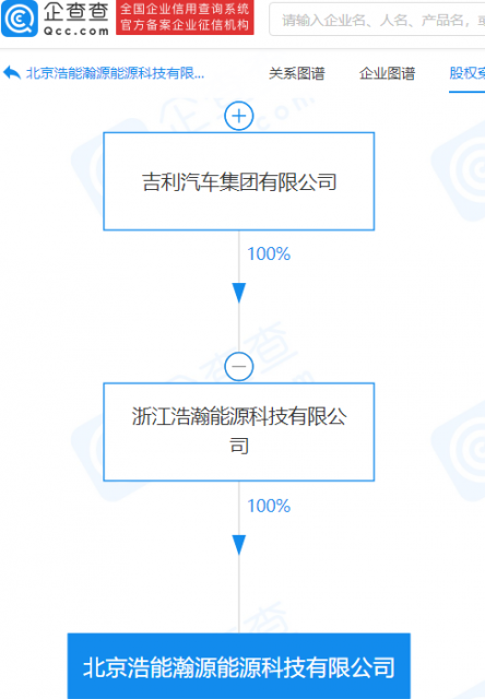 企查查股权穿透显示,该公司由浙江浩瀚能源科技有限公司100%控股,后者为吉利汽车集团有限公司全资子公司。