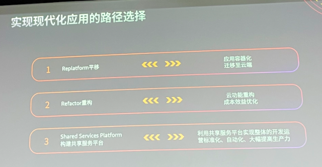 顾凡介绍,亚马逊云科技从服务的大量客户需求总结出“现代化应用转型的路径选择”:第一,Replatform平移;第二,Refactor重构;第三,Shared Services Platform,构建共享服务平台。而包括容器、Serverless、微服务、CI/CD等都是在现代化应用构建过程中常见的技术。