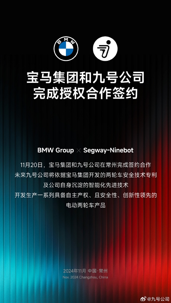 宝马集团和九号公司完成授权合作签约 共同打造电动两轮车快讯