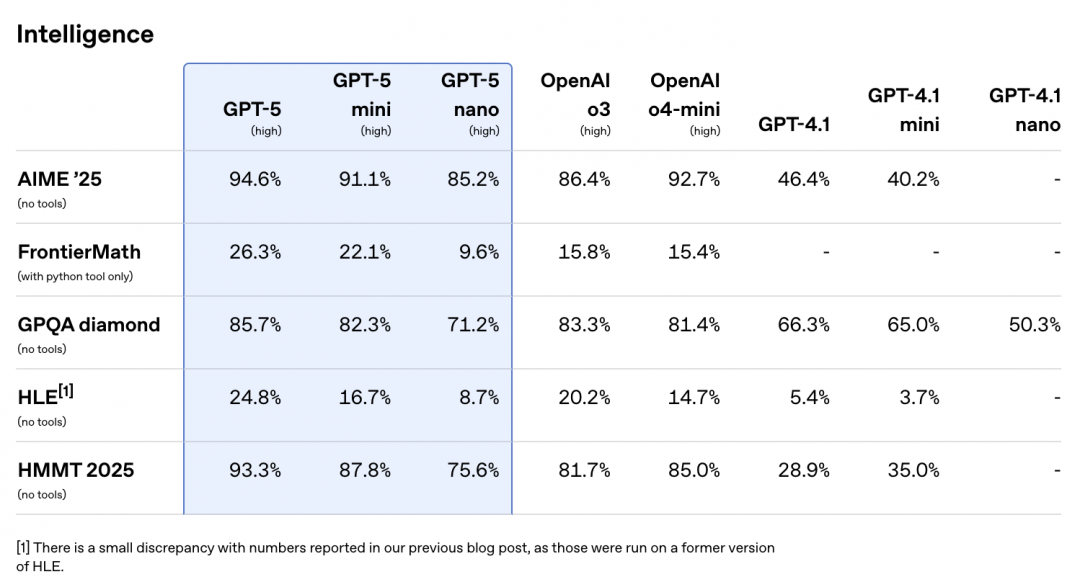 从官方放出的“跑分”情况,多项基准测试中,GPT-5超过了OpenAI o3、GPT-4o等此前OpenAI最强大的模型,在数学、编码、视觉感知和健康方面表现尤其出色。
