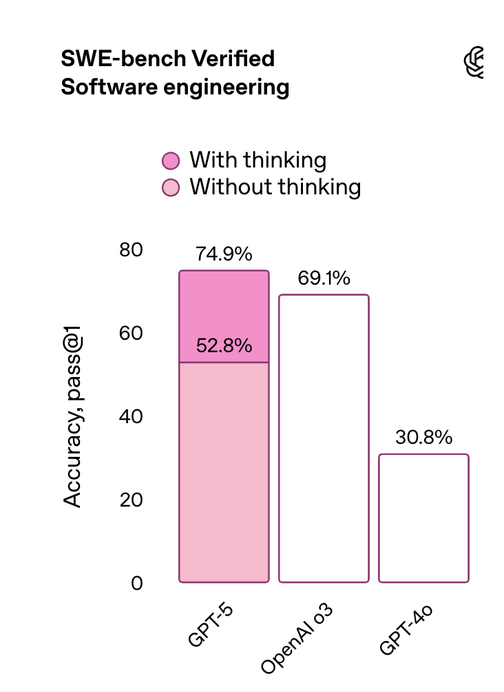 在真实世界编程SWE-benchVerified测试中GPT-5得分74.9%,较o3版本的69.1%有所提升。GPT‑5以更高的效率和速度获得了高分:与o3在高推理强度下相比,GPT‑5的输出tokens数量减少了22%,工具调用次数减少了45%。