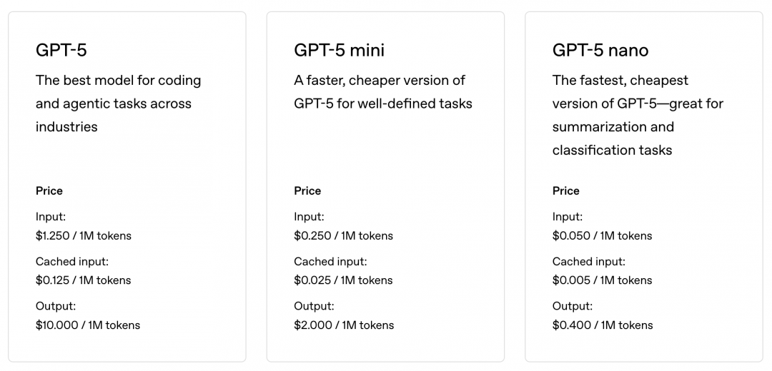 GPT-5:输入1.25美元/百万token,输出10美元/百万tokenGPT-5 mini:输入0.25美元/百万token,输出2美元/百万tokenGPT-5 nano:输入0.05美元/百万token,输出0.4美元/百万token。