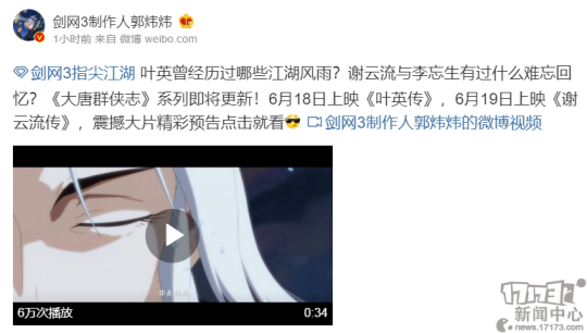 根据郭炜炜在微博中的说明,《大唐群侠志》系列动画即将更新!6月18日将会首先上映《叶英传》,随后在6月19日上映《谢云流传》。