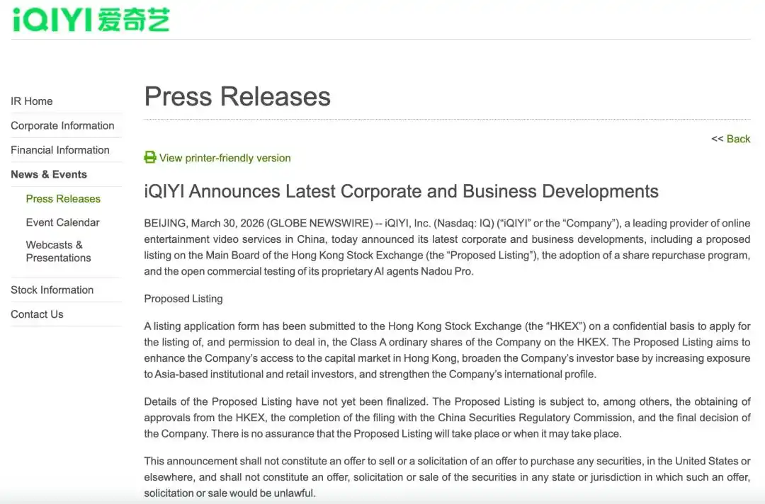 【TechWeb】3月31日消息,昨日晚间,爱奇艺在美国纳斯达克市场发布公告称,公司已以保密方式向香港联合交易所提交上市申请,申请公司A类普通股在港交所上市及交易许可。