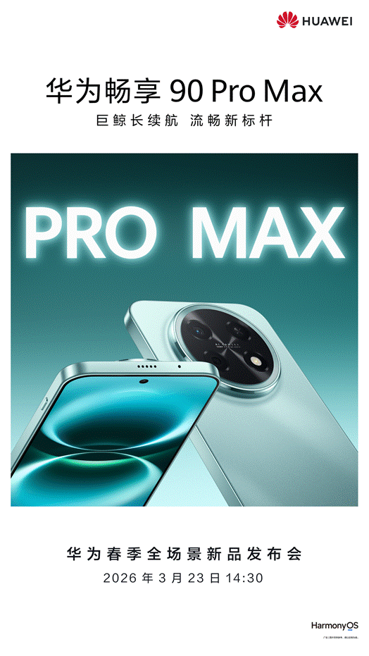 3月16日,华为终端正式官宣华为春季全场景新品发布会预热海报,随后发布华为畅享 90 Pro Max与华为畅享 90 Plus两款产品的官方预热海报,进一步明确华为畅享 90系列将亮相3月23日的新品发布会,重申续航、流畅、防诈等核心卖点。