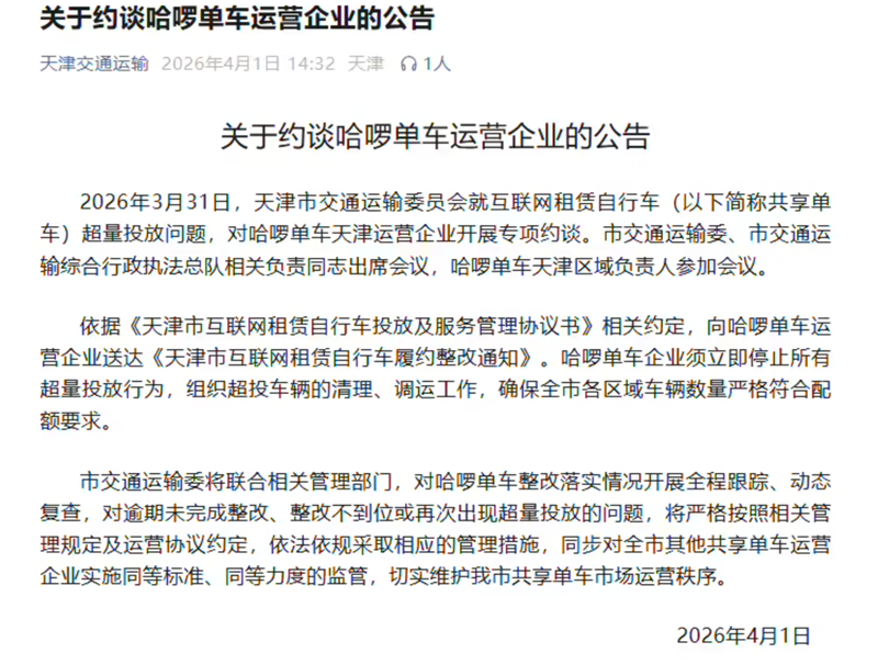 【TechWeb】4月1日消息,据天津交通运输公众号消息,天津市交通运输委员会于 2026 年 3 月 31 日就共享单车超量投放问题,对哈啰单车天津运营企业进行了专项约谈。