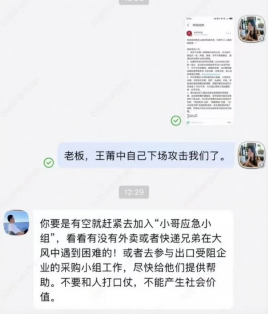 据其朋友圈截图显示,刘强东本人得知今日早间王莆中的言论回应称:要是有空就赶紧去加入“小哥应急小组”,看看有没有外卖或者快递兄弟在大风中遇到困难的!或者去参与出口受阻企业的采购小组工作,尽快给他们提供帮助。